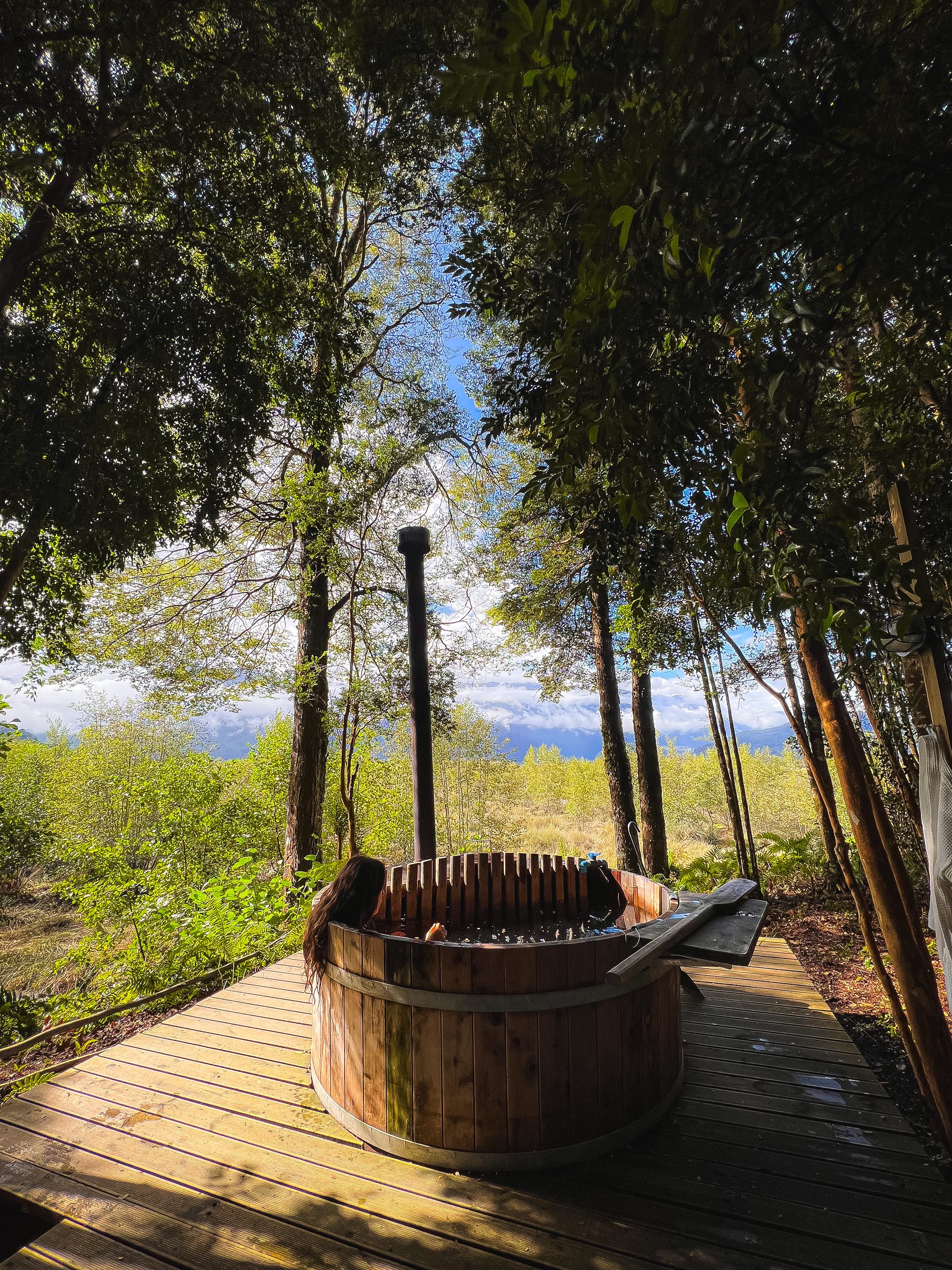 Terraza cubierta con voladizo profundo y salón exterior. Un baño privado con agua caliente. Bañera de leña, justo al lado de la terraza.